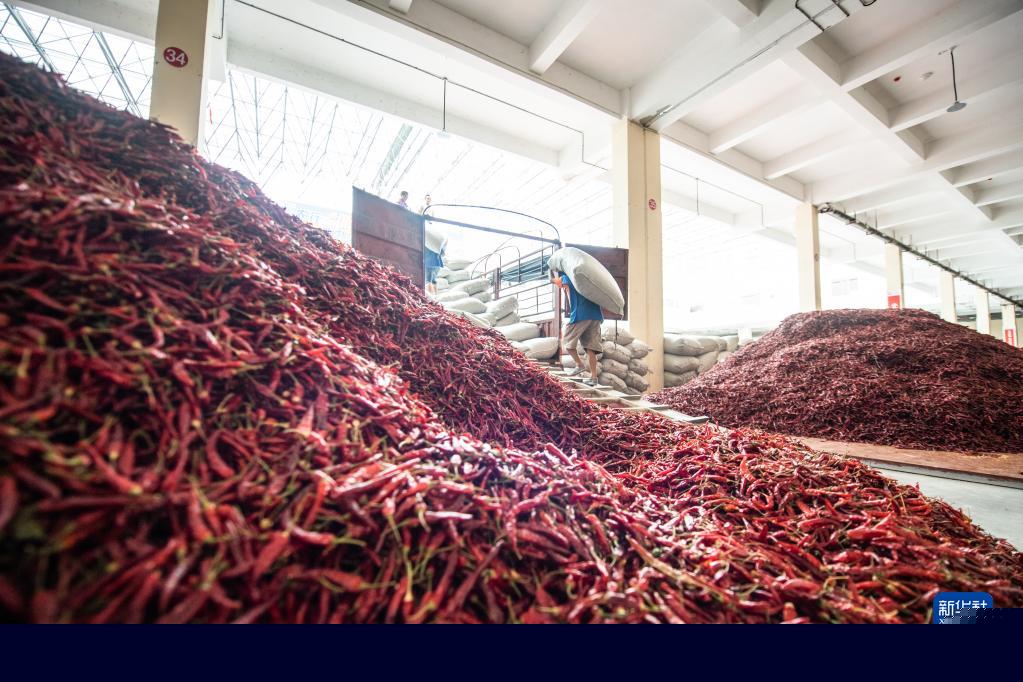 工人在遵義市新蒲新區(qū)中國辣椒城搬運辣椒進行裝車(2020年8月13日攝)。新華社記者 陶亮 攝