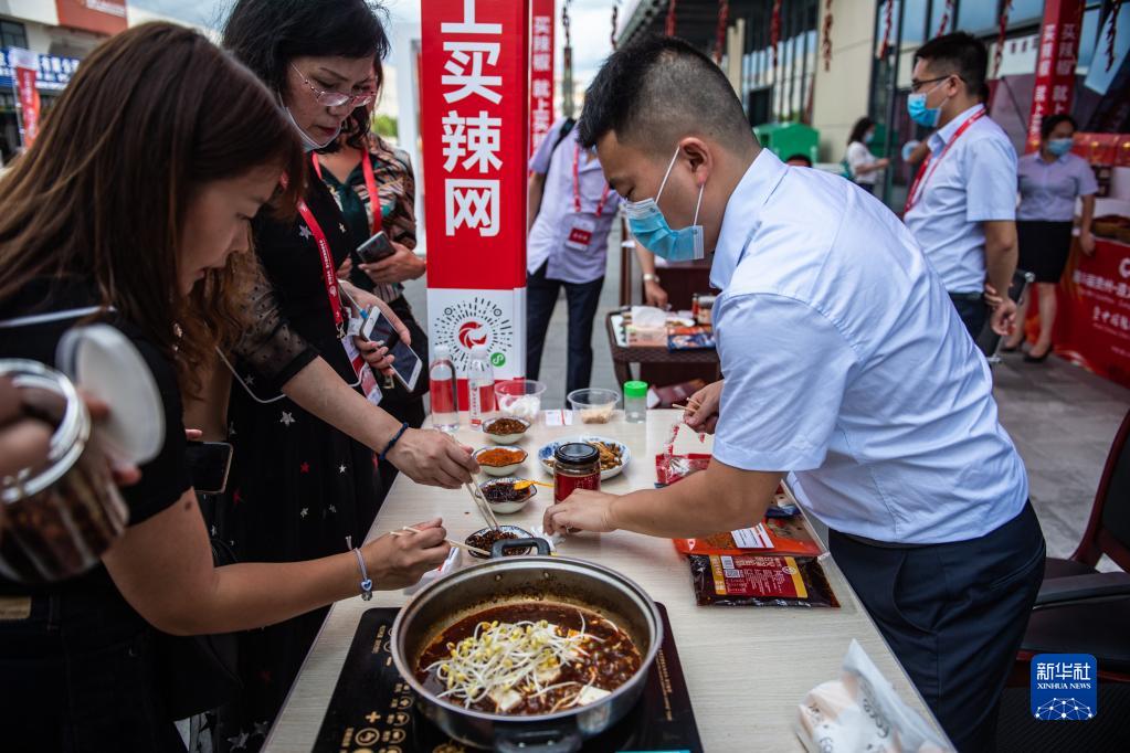 人們在遵義市新蒲新區(qū)中國辣椒城品嘗辣椒醬(2020年8月18日攝)。新華社記者 陶亮 攝