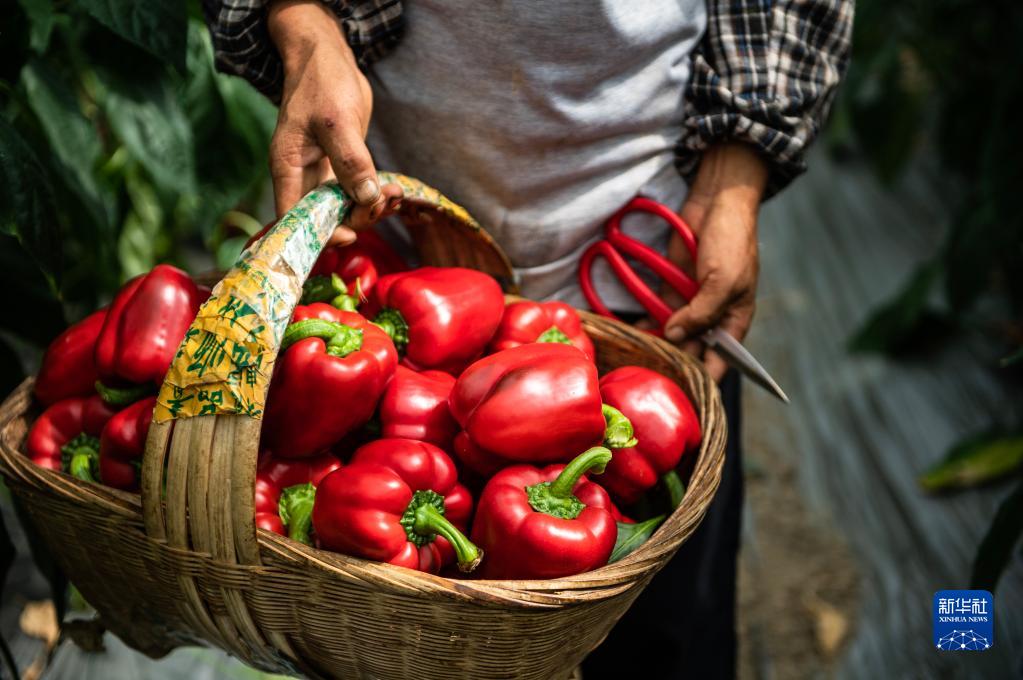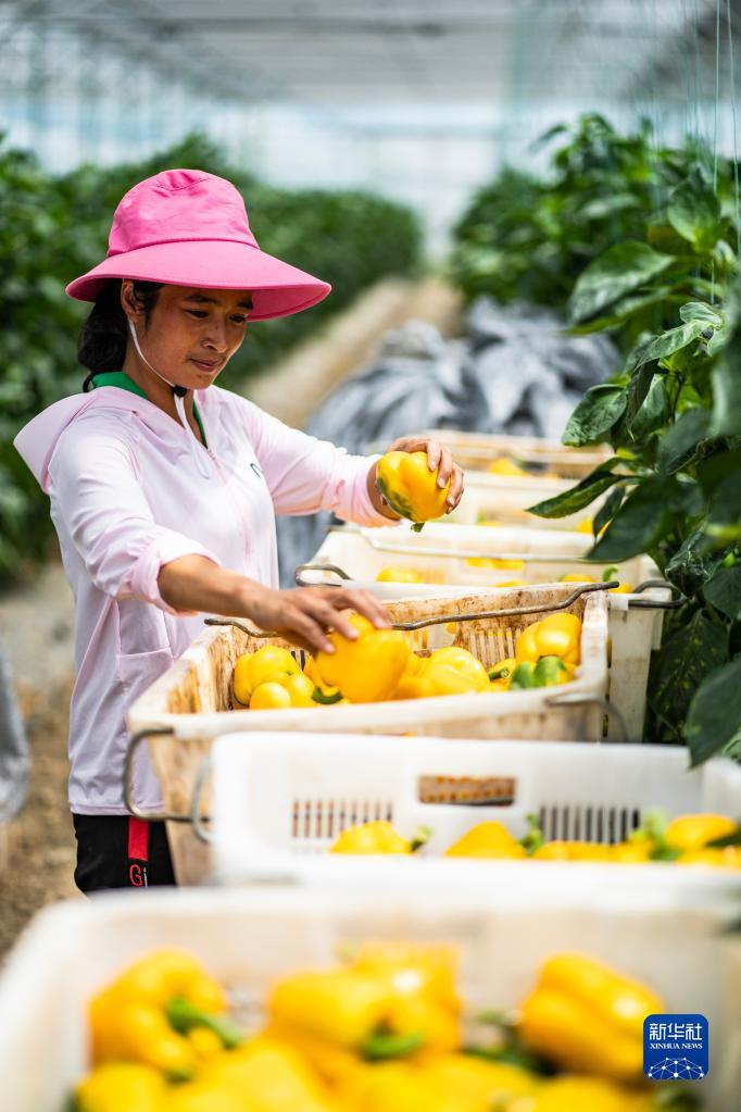 當?shù)卮迕裨谫F陽農(nóng)投集團花溪蔬菜基地采收的柿子椒(7月30日攝)。新華社記者 陶亮 攝