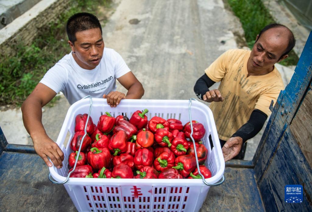 當?shù)卮迕裨谫F陽農(nóng)投集團花溪蔬菜基地將采收好的柿子椒裝車(7月30日攝)。新華社記者 陶亮 攝