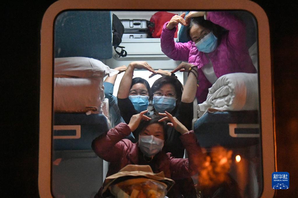 10月29日,滯留游客離開(kāi)額濟(jì)納旗時(shí),在列車(chē)車(chē)廂里與地面人員告別。新華社發(fā)(王磊 攝)