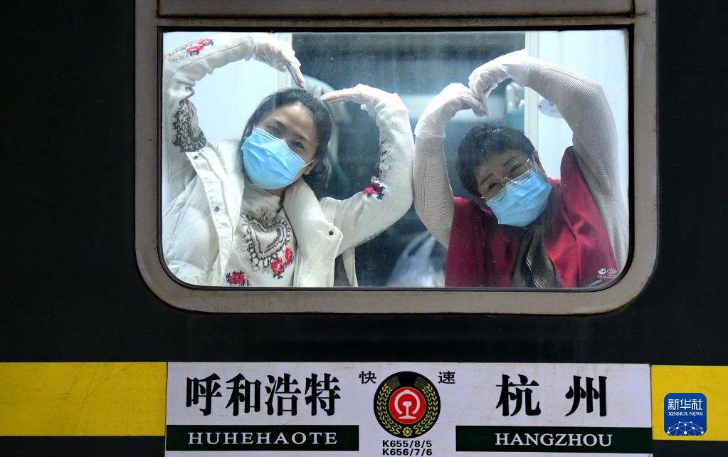 10月29日,一名滯留游客離開(kāi)額濟(jì)納旗時(shí),在列車(chē)車(chē)廂里用雙手比劃出“愛(ài)心”。新華社發(fā)(王磊 攝)