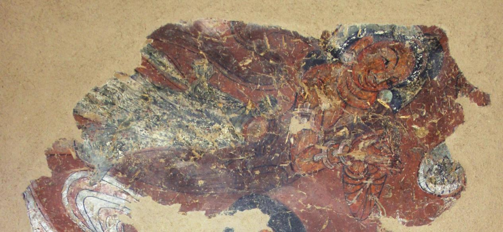 武威市天梯山石窟保護研究所文物研究室主任蔡建宏介紹,此壁畫位于第4窟中心柱背面第一級塔柱上沿處,整幅壁畫面積約為0.6平方米。壁畫中自下而上共出現(xiàn)了三身人物形象:最下面一身殘缺,僅存雙眼至頭頂部分;中間一身為胡跪式供養(yǎng)菩薩形象;上層為完整的橫式飛天形象。