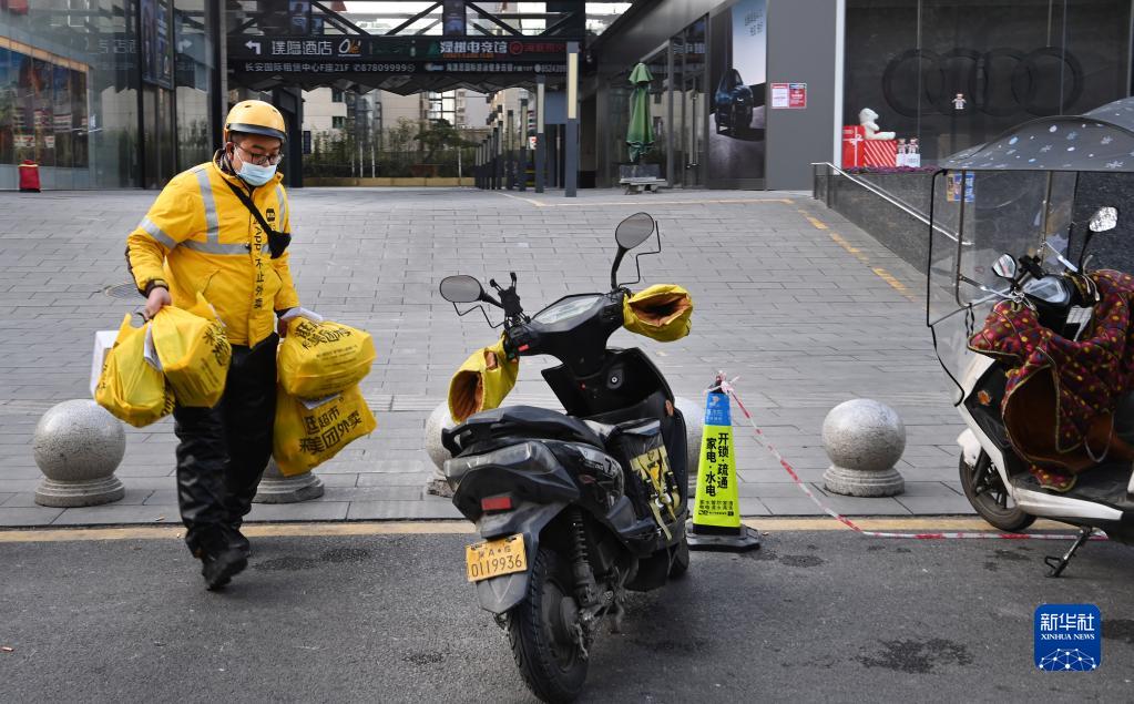 12月26日,外賣(mài)員在西安市南門(mén)外路邊忙碌。新華社記者 陶明 攝