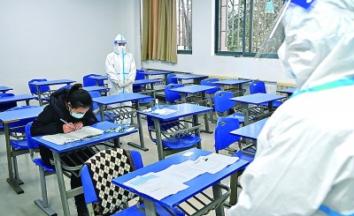 12月25日,西安外國語大學考點隔離考區(qū),監(jiān)考人員在單人隔離考場監(jiān)考。新華社記者 劉瀟攝