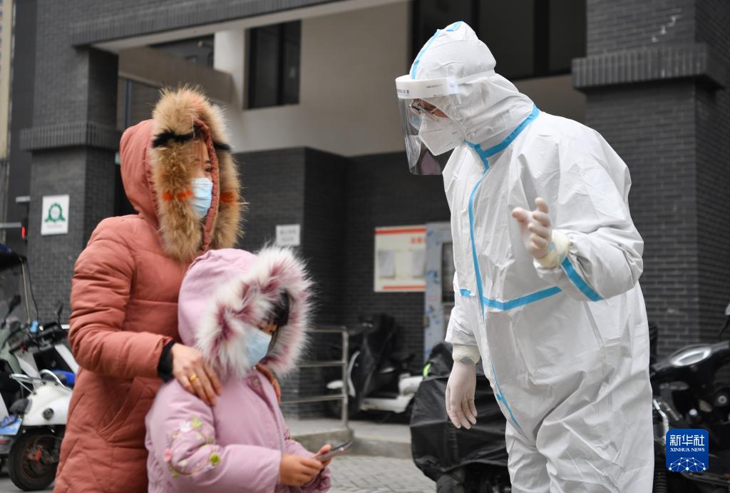 12月27日,在西安市雁塔區(qū)孟村小區(qū),盧晨陽(左二)引導居民進行核酸檢測。新華社記者 張博文 攝