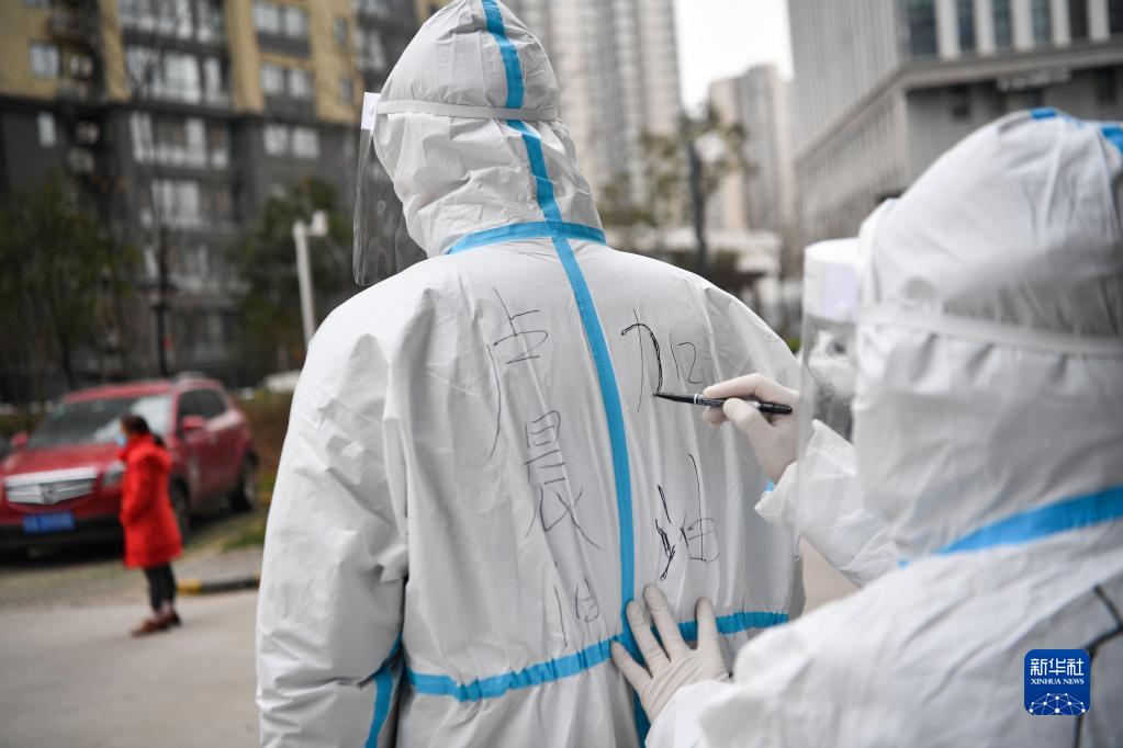 12月27日,在西安市雁塔區(qū)孟村小區(qū),社區(qū)工作人員在盧晨陽的防護服寫加油標語。新華社記者 張博文 攝