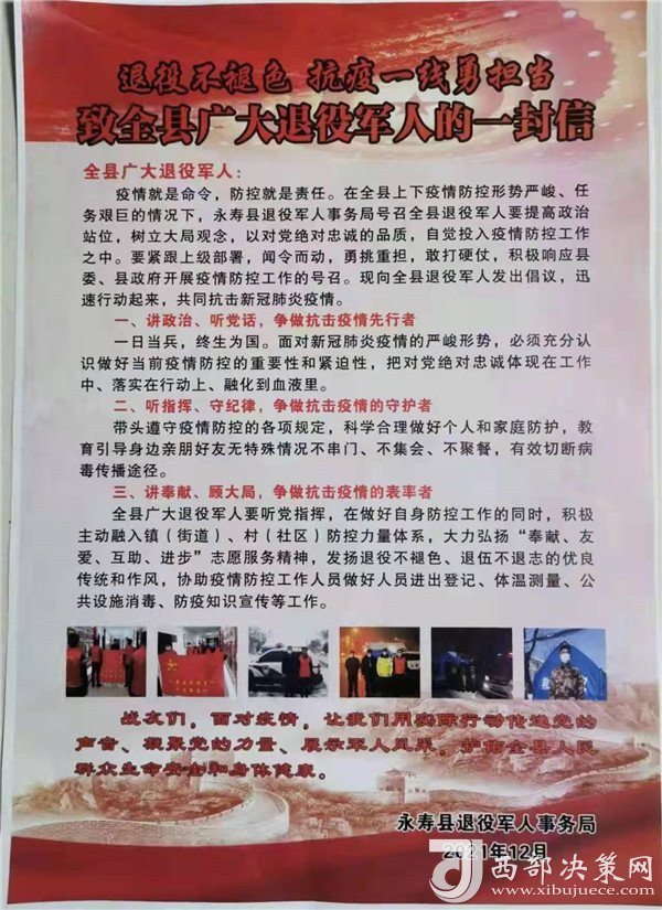 12月24日,永壽縣退役軍人事務(wù)局向全縣廣大退役軍人發(fā)出了《退役不褪色,抗疫一線勇?lián)?dāng)》的一封信,倡議一發(fā)出,志愿者們紛紛主動請纓,聯(lián)名遞交了疫情防控一線作戰(zhàn)的請戰(zhàn)書。連夜集結(jié),在永壽縣退役軍人事務(wù)局召開了“抗擊疫情沖鋒在前”退役軍人志愿者誓師動員大會,局主要負責(zé)同志向廣大退役軍人志愿者作了戰(zhàn)前動員,大家激情高漲,“必勝、必勝、必勝”的口號響徹整個大樓,用實際行動堅守在疫情防治的第一線。