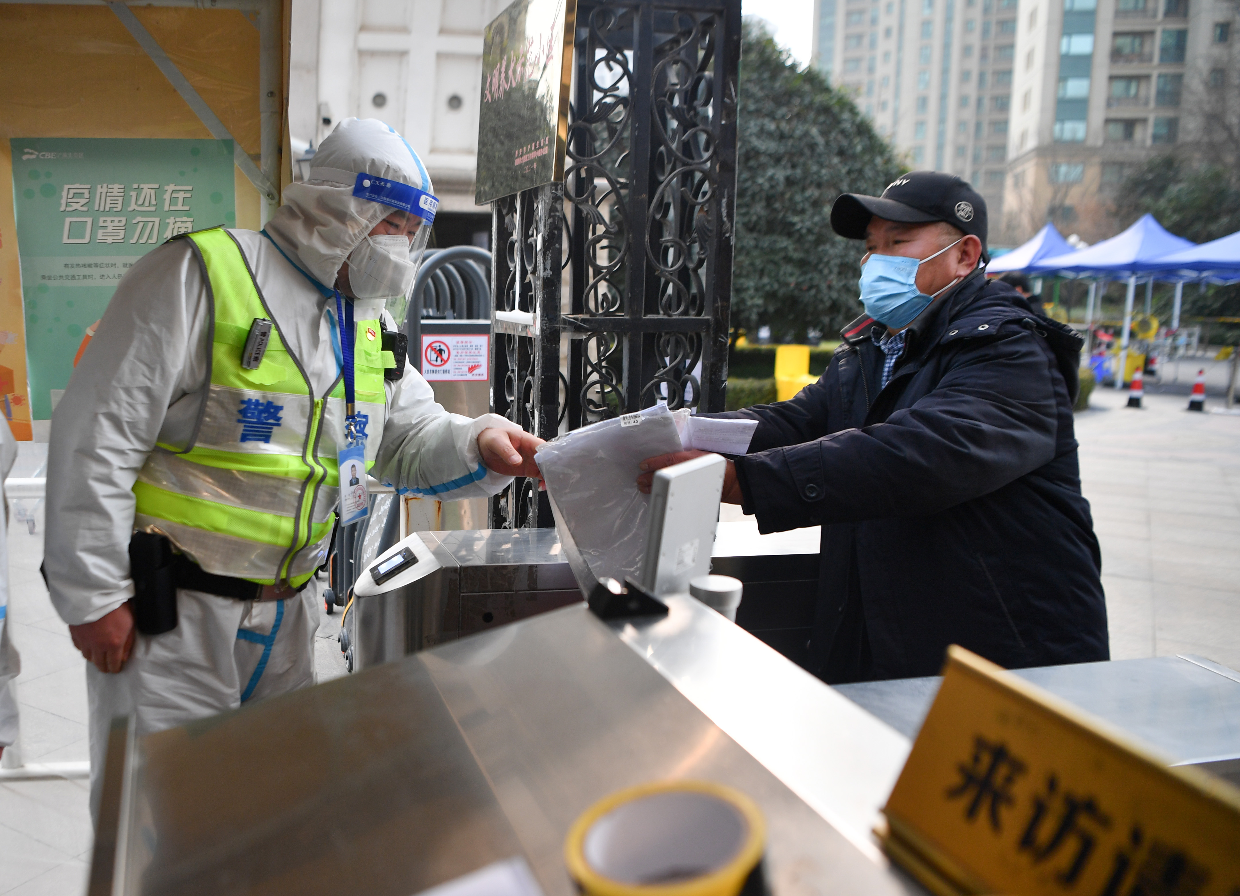 1月10日,西安市公安局浐灞生態(tài)區(qū)分局民警在負責執(zhí)勤的社區(qū)向居民講解疫情防控政策。新華社記者 張博文 攝