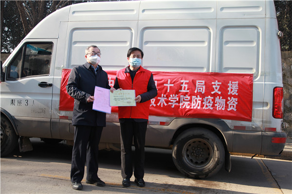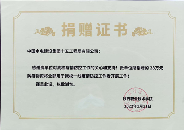 1月11日下午15:00,在陜西職業(yè)技術(shù)學(xué)院舉行簡(jiǎn)短捐贈(zèng)儀式,陜西職業(yè)技術(shù)學(xué)院黨委副書(shū)記、院長(zhǎng)劉勝輝,黨委副書(shū)記、紀(jì)委書(shū)記何軍,副院長(zhǎng)王慶等參加了捐贈(zèng)儀式。劉勝輝代表學(xué)院黨委向我公司表示感謝,他表示,在疫情防控的關(guān)鍵時(shí)刻,水電十五局一周內(nèi)2批次送來(lái)價(jià)值近28萬(wàn)元生活物資,及時(shí)緩解更極大充實(shí)和豐富了我校抗疫生活物資,為我院師生樹(shù)立了光輝榜樣,堅(jiān)定了共克時(shí)艱的信心和決心。何軍向公司黨委副書(shū)記、紀(jì)委書(shū)記、工會(huì)主席任志宏贈(zèng)送了捐款證明和感謝信。任志宏表示,水電十五局作為駐陜央企,一直以來(lái),堅(jiān)決貫徹落實(shí)黨中央決策部署,主動(dòng)響應(yīng)陜西省委組織部和省國(guó)資委號(hào)召,面對(duì)此次疫情,將積極踐行央企擔(dān)當(dāng),履行社會(huì)責(zé)任,用實(shí)際行動(dòng)為西安高校疫情防控貢獻(xiàn)一份力量!