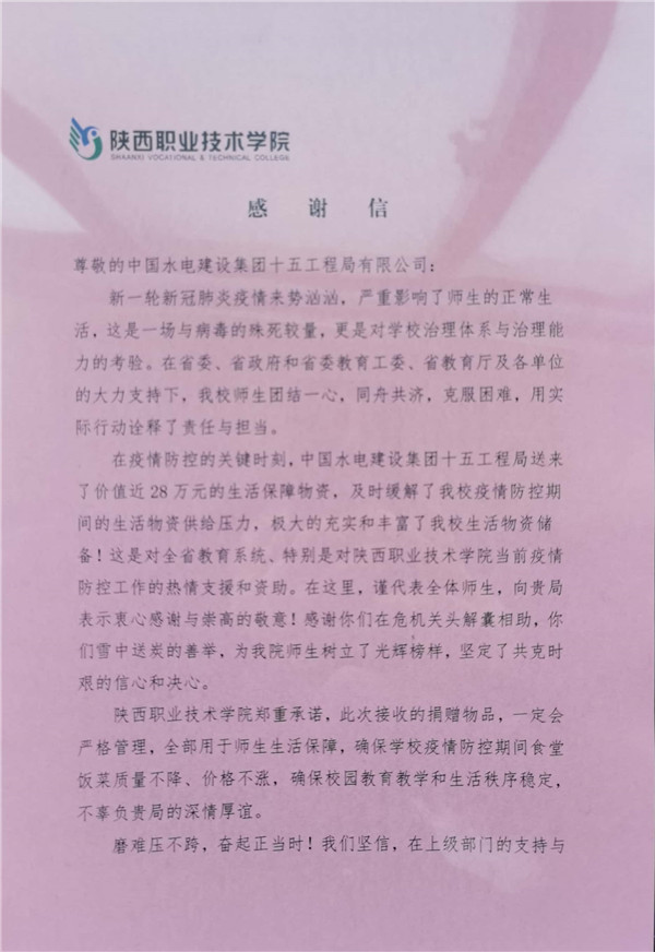 “感謝貴單位在關(guān)鍵時(shí)期雪中送炭,于危急關(guān)頭解囊相助……這是對(duì)陜西省教育系統(tǒng)、特別是陜西職業(yè)技術(shù)學(xué)院疫情防控工作的熱情支援和資助!”