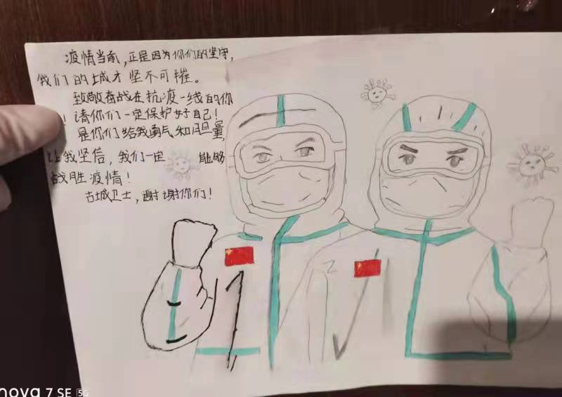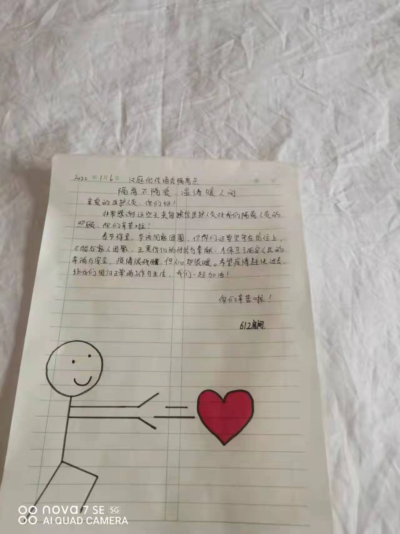 一幅幅手抄報,一封封感謝信,一條條群留言,都在記錄著一個個勇毅且溫情的抗疫瞬間。“今天是我被隔離的最后一天,收拾好書包和小行李箱,準(zhǔn)備回家了,看著剩余的水果、零食,此刻心里不止是歡喜和激動,還有一絲不舍……”一名小學(xué)生在感謝信中寫到:“接到老師的通知,我們要集體隔離,內(nèi)心還有點(diǎn)害怕,不知該怎么辦,來到酒店后,看到張張和藹可親的臉,我的心放下了,你們?yōu)槲覀儾珊怂?、送飯菜,讓我感到溫暖,感謝強(qiáng)大的祖國,我們一定好好學(xué)習(xí),長大做一個對社會有用的人”。據(jù)介紹,隔離期間,有四名12歲的學(xué)生是獨(dú)自隔離,沒有家人的陪護(hù),在工作人員每天的問候中,他們懂事有禮貌,只要求工作人員幫他們打印作業(yè),每天在房間堅持看書學(xué)習(xí)。