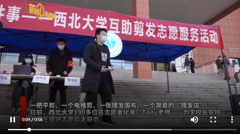 一把平剪、一個電推剪、一張理發(fā)圍布、一個簡易的“理發(fā)店”……日前,西北大學190多位名志愿者化身“Tony老師”,為學校長安校區(qū)師生提供志愿剪發(fā)服務。