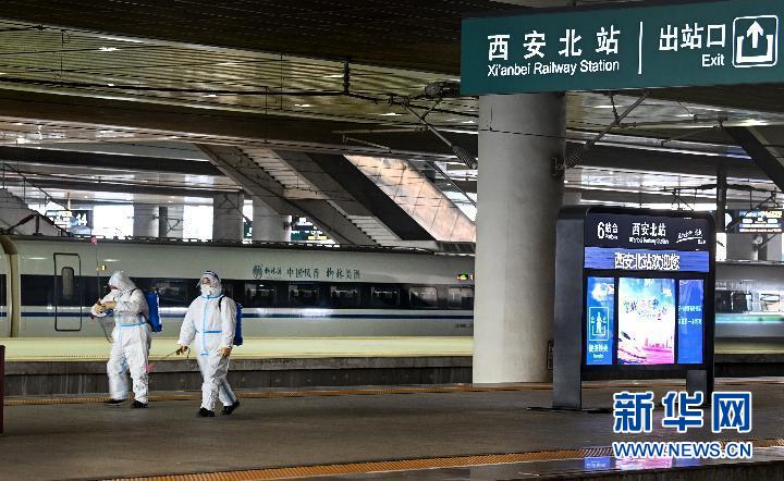 1月16日,工作人員對(duì)西安北站站臺(tái)進(jìn)行消殺。新華社記者 陶明 攝