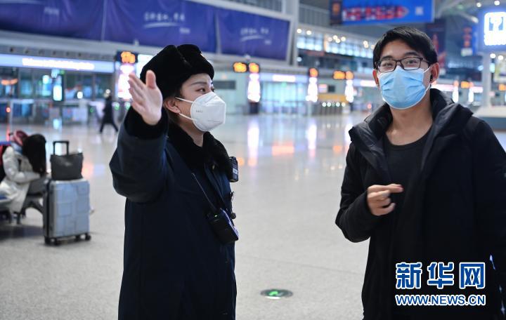 1月16日,西安北站客運(yùn)員(左)在候車大廳引導(dǎo)旅客乘車。新華社記者 陶明 攝