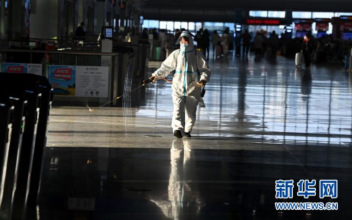 1月16日,工作人員在對(duì)西安北站候車大廳進(jìn)行環(huán)境消毒。新華社記者 陶明 攝