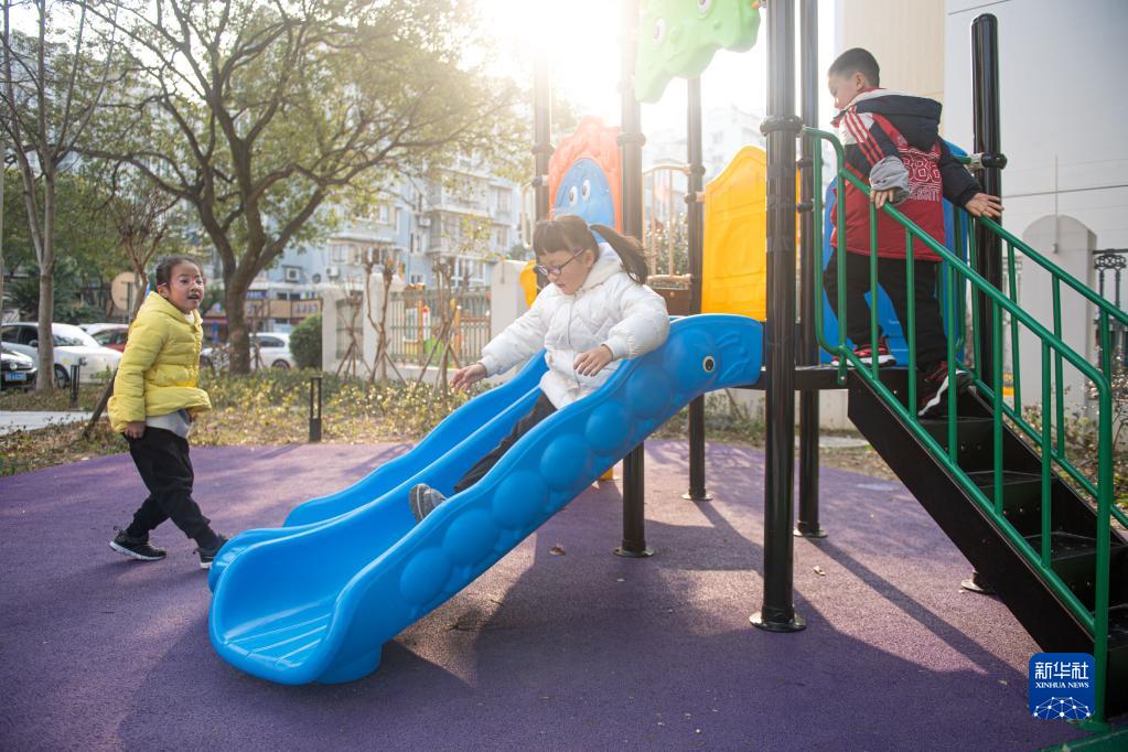 1月18日,小朋友在江北區(qū)桃源小區(qū)里玩耍。新華社記者 江漢 攝