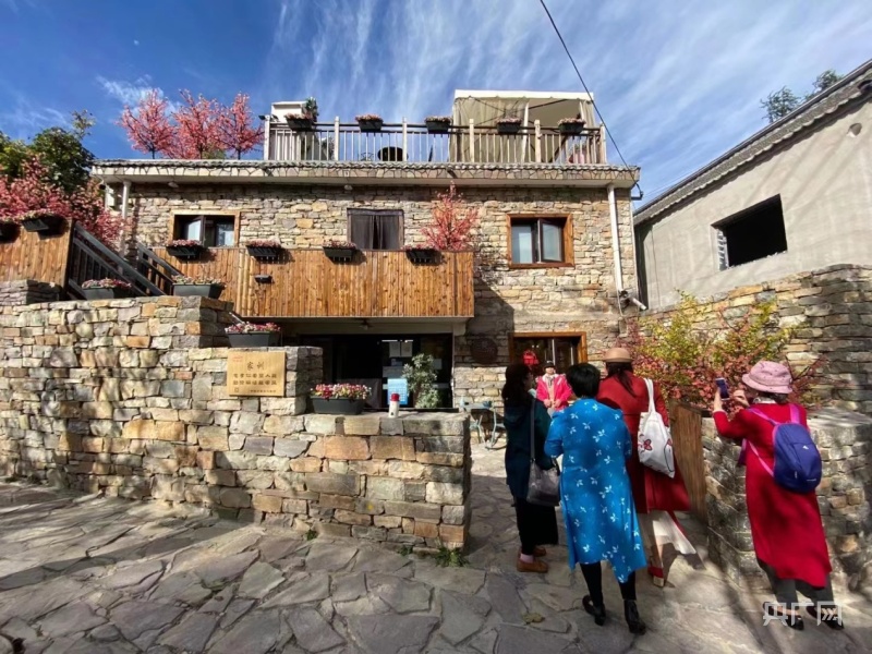 游客們在西井峪一民宿前拍照留念(央廣網記者 褚夫晴 攝)