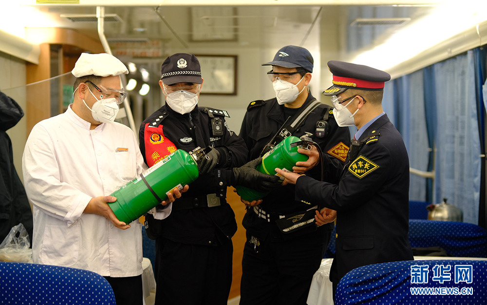 乘警蔣大兵與列車工作人員檢查消防器材。新華網(wǎng)發(fā) 賀瑞明攝