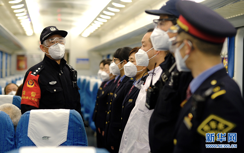 乘警蔣大兵與列車工作人員商討列車治安防范等工作。新華網(wǎng)發(fā) 賀瑞明攝