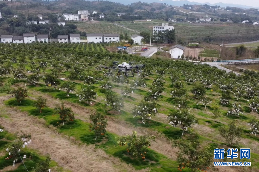 一架植保無人機正在渝北區(qū)大盛鎮(zhèn)青龍村的果園內噴灑營養(yǎng)液。新華網(wǎng) 耿駿宇 攝