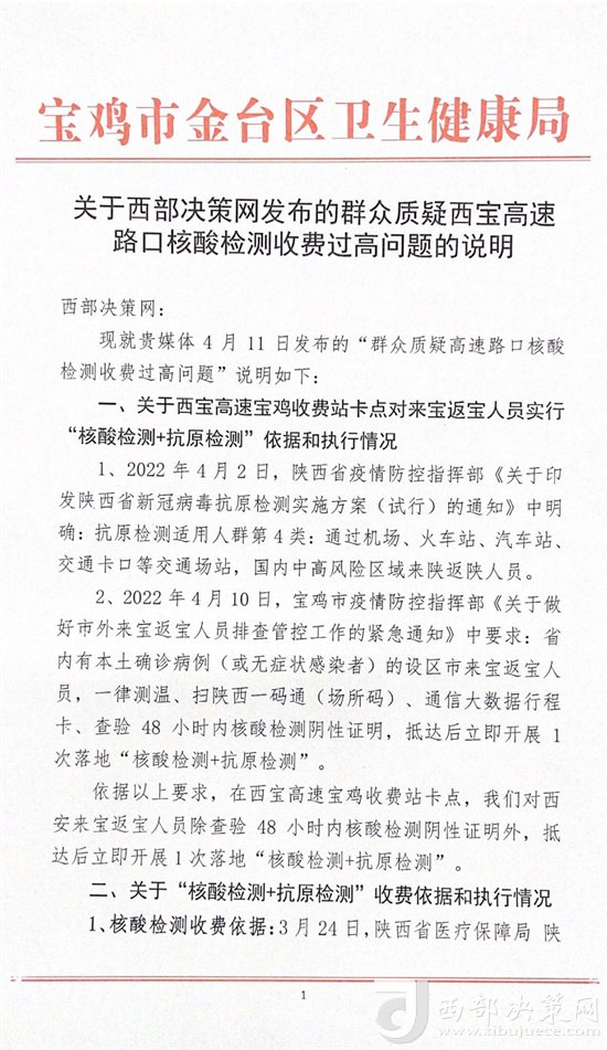熱線回復(fù)|4月11日,寶雞市金臺區(qū)衛(wèi)生健康局就“群眾質(zhì)疑高速路口核酸檢測收費(fèi)過高問題”向西部決策網(wǎng)回復(fù)并進(jìn)行了情況說明。具體內(nèi)容如下: