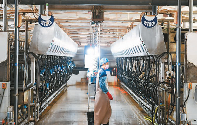 近年來,內(nèi)蒙古自治區(qū)巴彥淖爾市臨河區(qū)干召廟鎮(zhèn)依托當(dāng)?shù)貎?yōu)勢(shì)大力發(fā)展養(yǎng)牛產(chǎn)業(yè),采取“支部+合作社+基地+農(nóng)戶”的發(fā)展模式,帶動(dòng)農(nóng)戶發(fā)展養(yǎng)牛產(chǎn)業(yè),促進(jìn)農(nóng)戶增收致富,助力鄉(xiāng)村振興。圖為1月19日,巴彥淖爾市臨河區(qū)東鑫奶牛養(yǎng)殖專業(yè)合作社擠奶車間。貝 赫攝(新華社發(fā))
