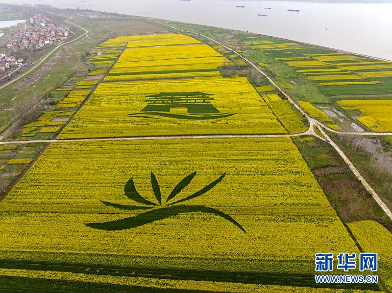 鄂州湖北現代農業(yè)科技創(chuàng)新與集成示范基地。從空中俯瞰,大片大片金黃的油菜花田里,鑲嵌著由一片綠色植物組成的圖案,綠黃分明,映襯出“鄂州基地”“中國飯碗”幾個大字。