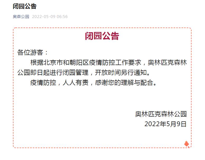 “奧森公園”微信公眾號(hào)9日發(fā)布閉園公告,根據(jù)北京市和朝陽區(qū)疫情防控工作要求,奧林匹克森林公園即日起進(jìn)行閉園管理,開放時(shí)間另行通知。