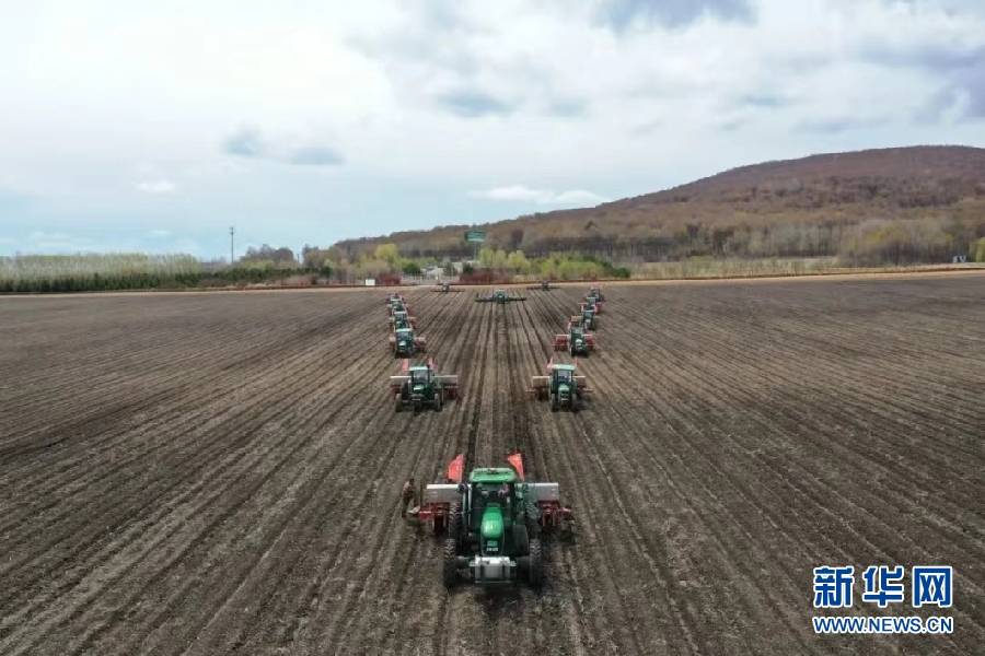 北大荒集團建三江分公司八五九農場有限公司數十臺大馬力巨無霸農機在田間播種大豆。新華網發(fā)(李明達 攝)