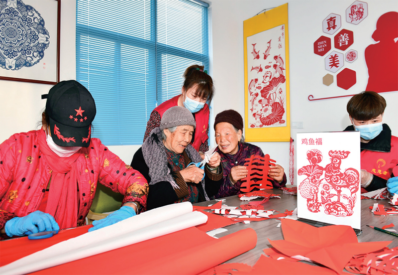 山東省日照市嵐山區(qū)按照就近、普惠原則建設(shè)養(yǎng)老服務(wù)中心,并組建志愿服務(wù)隊(duì)為老人提供助餐、助潔、助醫(yī)等愛心服務(wù)。圖為2022年2月27日,志愿者在日照市嵐山區(qū)虎山鎮(zhèn)黃家峪村養(yǎng)老服務(wù)中心陪老人剪紙、聊天?!⌒氯A社記者 郭緒雷/攝