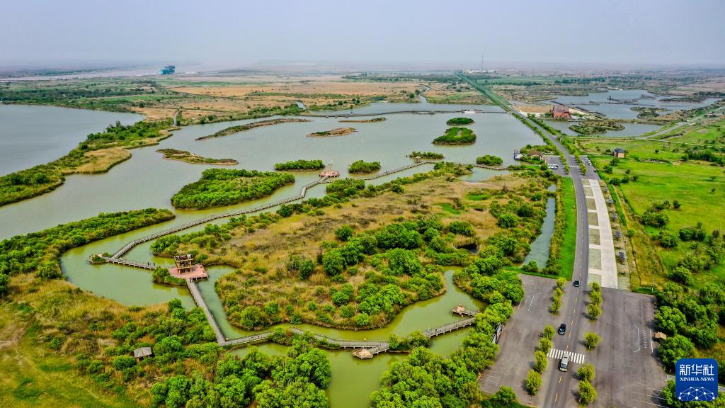 夏日的東營(yíng)市黃河入??跐竦?,綠草連天、百鳥(niǎo)翔集。