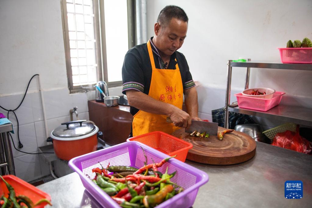2020年9月17日,在汝城縣沙洲瑤族村,朱小紅在自家開的農家樂廚房里切菜。新華社記者 陳思汗 攝