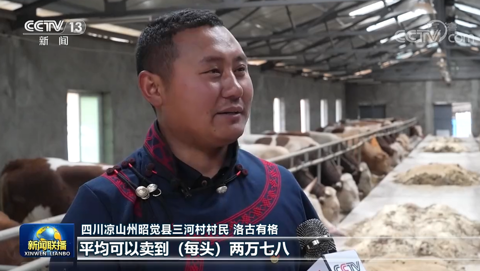 四川涼山州昭覺縣三河村村民 洛古有格:當(dāng)時總書記來的時候,我們這個養(yǎng)牛只有十幾頭。通過發(fā)展,我們?nèi)哟逵辛?000多頭這個西門塔爾牛?,F(xiàn)在我們這個牛,平均可以賣到(每頭)兩萬七八,大的可以賣到三萬多元,效益特別好。