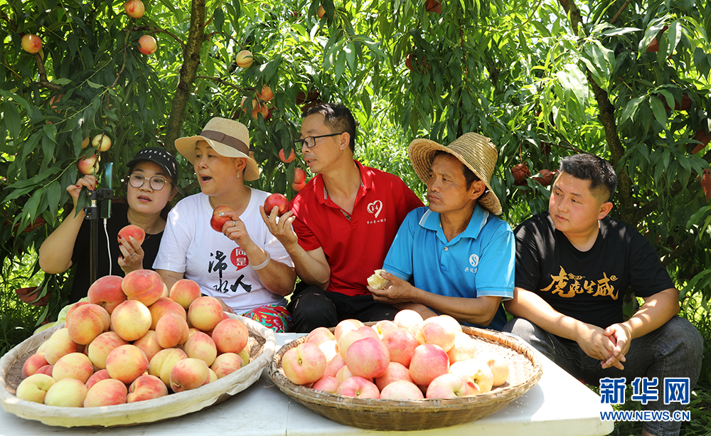 圖為黃岡市浠水縣“網(wǎng)紅”主播幫果農(nóng)直播銷售水蜜桃。新華網(wǎng)發(fā)
