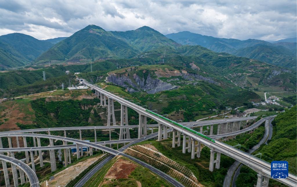 復興號列車通過中老鐵路南溪河特大橋(無人機照片,6月2日攝)。新華社記者 江文耀 攝