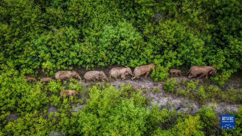 這是在云南省玉溪市元江縣境內拍攝的象群(無人機照片,2021年8月9日攝)。新華社記者 胡超 攝