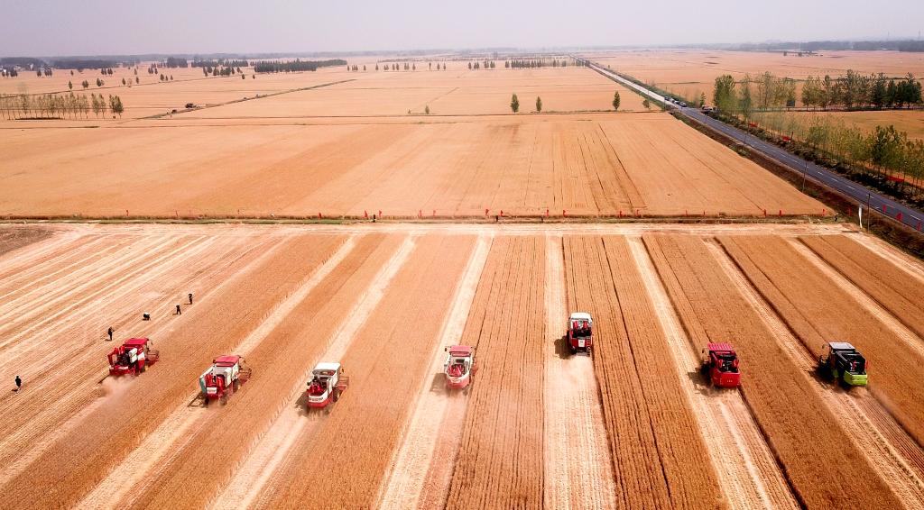 6月2日,收割機(jī)在臨沂市郯城縣郯城街道的麥田里收獲小麥。新華社記者郭緒雷 攝
