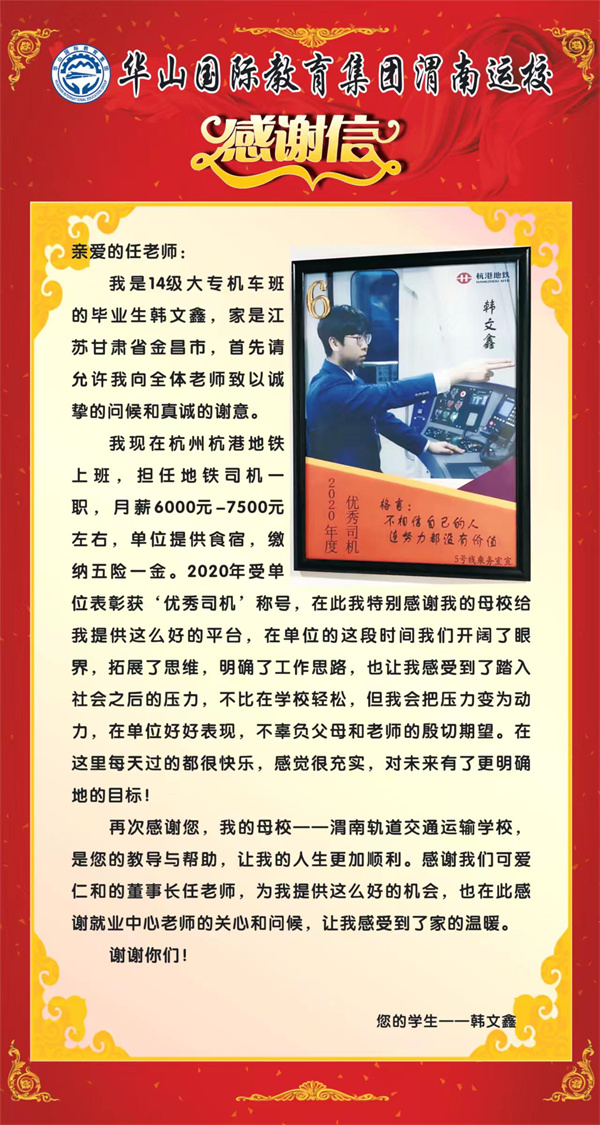 安置到杭港地鐵司機的我校優(yōu)秀畢業(yè)生韓文鑫,籍貫甘肅,月薪8000千以上
