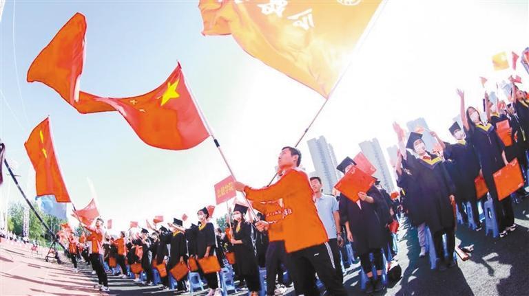 長(zhǎng)安大學(xué)畢業(yè)典禮上,同學(xué)們高舉五星紅旗。長(zhǎng)安大學(xué)供圖