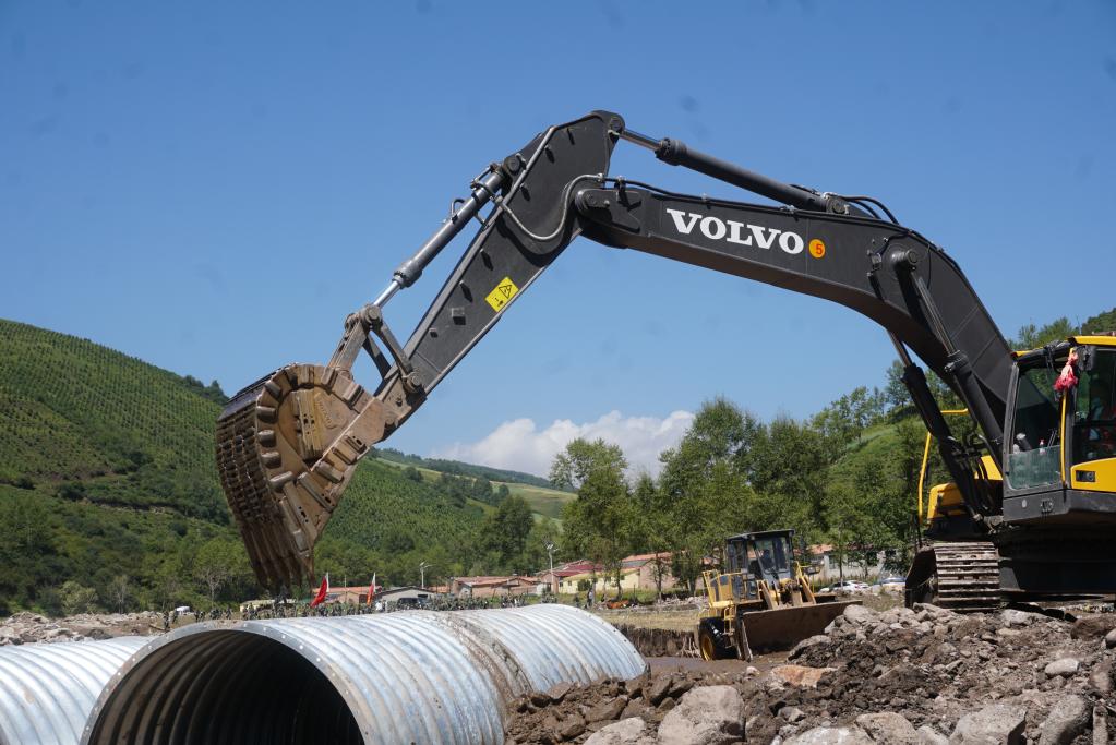 8月20日,在青海省西寧市大通回族土族自治縣青山鄉(xiāng)沙岱村,挖掘機(jī)準(zhǔn)備將一截波紋管涵放置到河道上。(新華社記者周盛盛 攝)