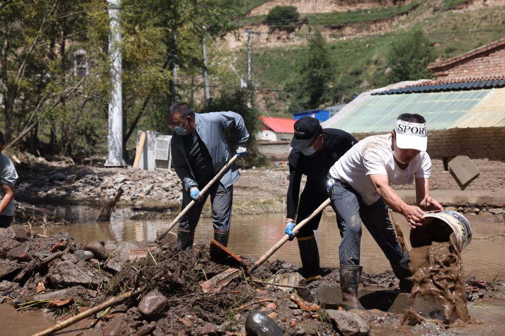 8月20日,在青海省西寧市大通回族土族自治縣青山鄉(xiāng),志愿者正在清淤。(新華社記者王浡 攝)