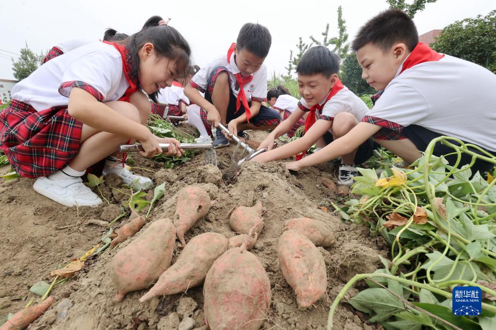 9月1日,浙江省湖州市德清縣雷甸鎮(zhèn)中心小學(xué)學(xué)生在校園農(nóng)場挖番薯。新華社發(fā)(謝尚國 攝)