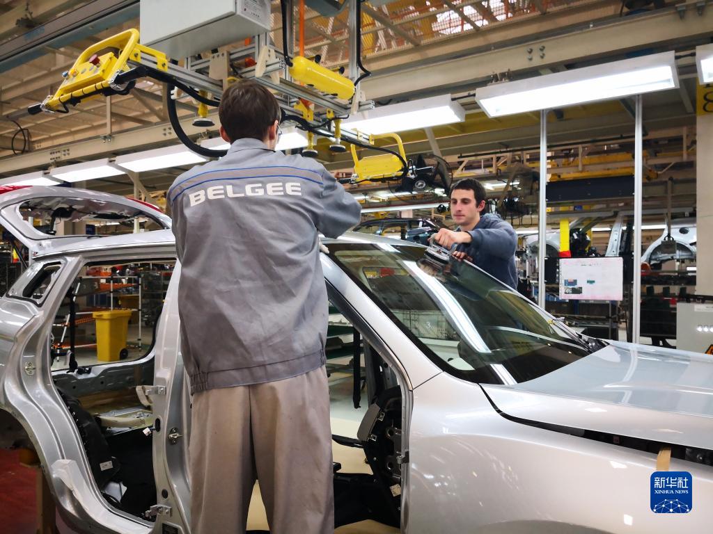 在白俄羅斯首都明斯克東北方向50公里處的白俄羅斯吉利全散件汽車(chē)制造廠總裝車(chē)間,工人組裝車(chē)體(2018年12月1日攝)。新華社記者 張若玄 攝