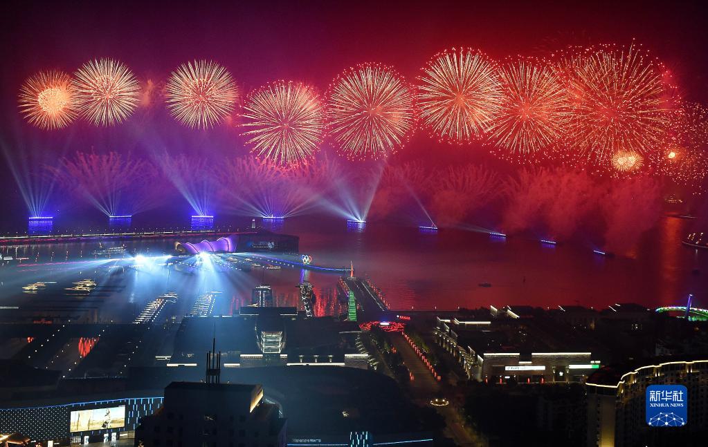 這是在青島舉行的《有朋自遠(yuǎn)方來(lái)》燈光焰火藝術(shù)表演(2018年6月9日晚攝)。2018年6月9日至10日,上海合作組織成員國(guó)元首理事會(huì)第十八次會(huì)議在青島召開(kāi)。新華社記者 李紫恒 攝