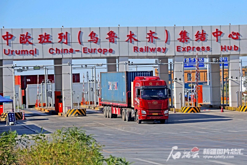 7月14日,一臺(tái)卡車從烏魯木齊國(guó)際陸港區(qū)中歐班列(烏魯木齊)集結(jié)中心駛出(資料圖片)。 石榴云/新疆日?qǐng)?bào)記者 蔡增樂(lè)攝