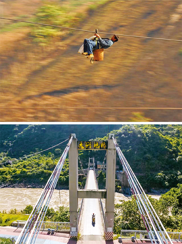 “過江靠溜索”曾是怒江兩岸群眾出行的重要方式。2013年,國家實施“溜索改橋”項目,幫助西部邊遠(yuǎn)山區(qū)群眾結(jié)束溜索時代,怒江州怒江段上溜索被改造為各式跨江橋梁,完成了沿江人民“天塹變通途”的企盼。上圖為2013年2月2日,在云南省怒江州瀘水市六庫街道,一名居民背著背簍溜索過江(新華社記者 王長山/攝)。下圖為2022年9月13日,瀘水市居民騎摩托車通過大興地橋(無人機照片,新華社記者 江文耀/攝)。