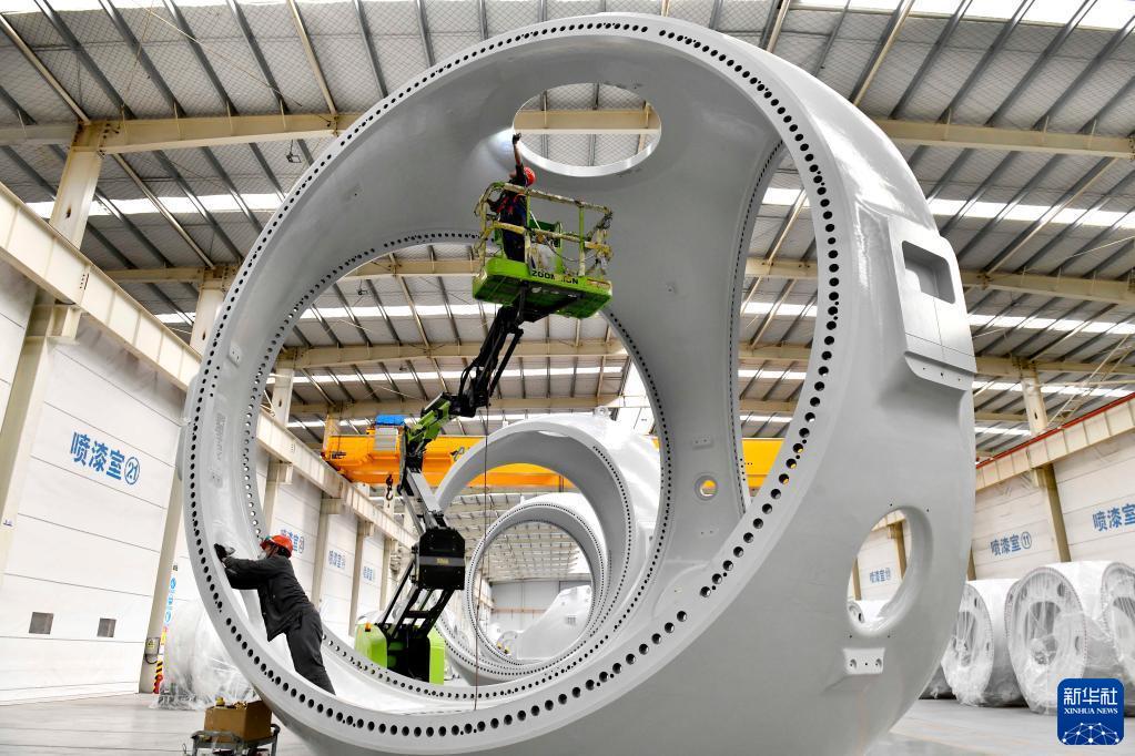 在山東省惠民縣風(fēng)電裝備產(chǎn)業(yè)基地涂裝車間,工作人員對風(fēng)電輪轂進行涂裝(2022年6月7日攝)。新華社記者 郭緒雷 攝