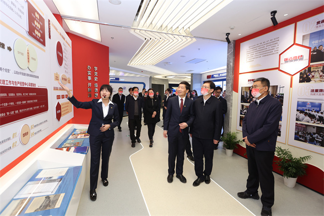 梁向峰在企業(yè)展廳向西咸新區(qū)黨工委副書記、管委會(huì)主任姜建春介紹水電十五局近年黨建情況