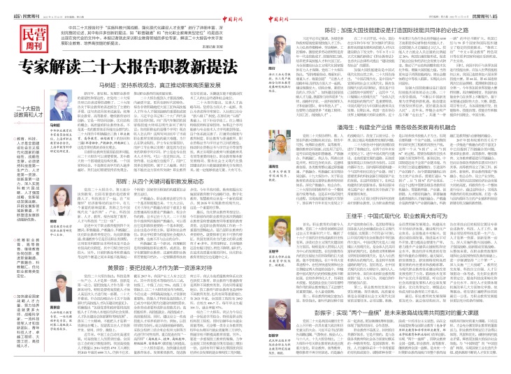 【《中國新聞》報記者 劉軍 報道】中共二十大報告對于“實施科教興國戰(zhàn)略,強化現(xiàn)代化建設(shè)人才支撐”進行了詳細豐富、深刻完整的論述,其中有許多創(chuàng)新的提法,如“職普融通”和“優(yōu)化職業(yè)教育類型定位”均是首次出現(xiàn)在黨代會的文件中。本報記者就此采訪職業(yè)教育領(lǐng)域的多位專家,解讀二十大報告中關(guān)于發(fā)展職業(yè)教育、培養(yǎng)高技能的新提法。